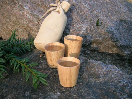 Sett med 3 drammeglass i tre, levert i et elegant skinnetui.